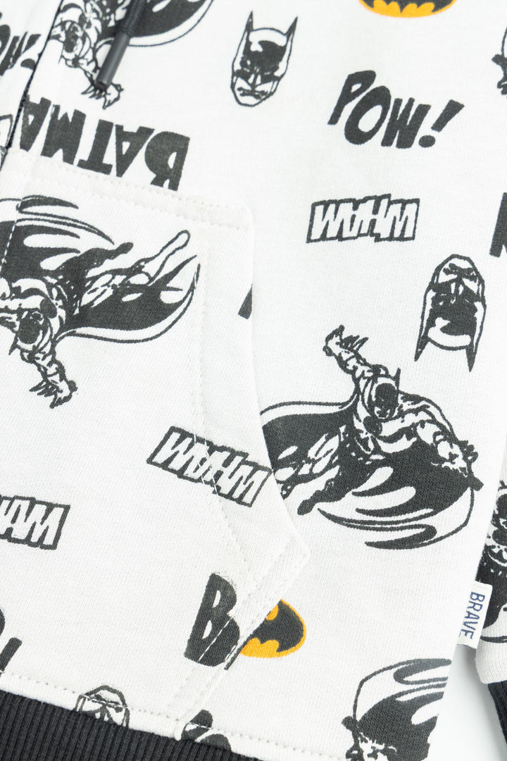 Get him geared up for action with this dynamic Boys' Batman Graphic Full-Zip Fleece Hoodie. This cozy hoodie is covered in a bold, all-over print featuring iconic Batman poses, logos, and classic comic book action phrases like "POW!" and "WHAM!". Crafted from soft, durable fleece, it provides fantastic warmth and comfort for everyday adventures. .