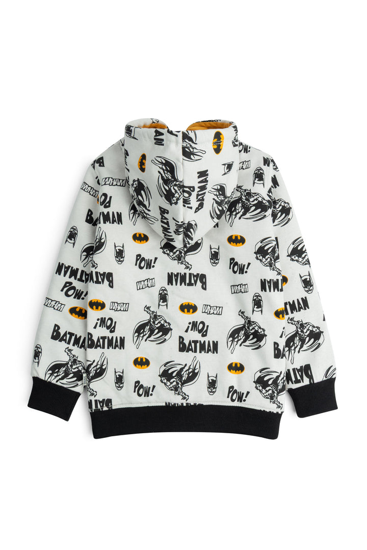 Get him geared up for action with this dynamic Boys' Batman Graphic Full-Zip Fleece Hoodie. This cozy hoodie is covered in a bold, all-over print featuring iconic Batman poses, logos, and...