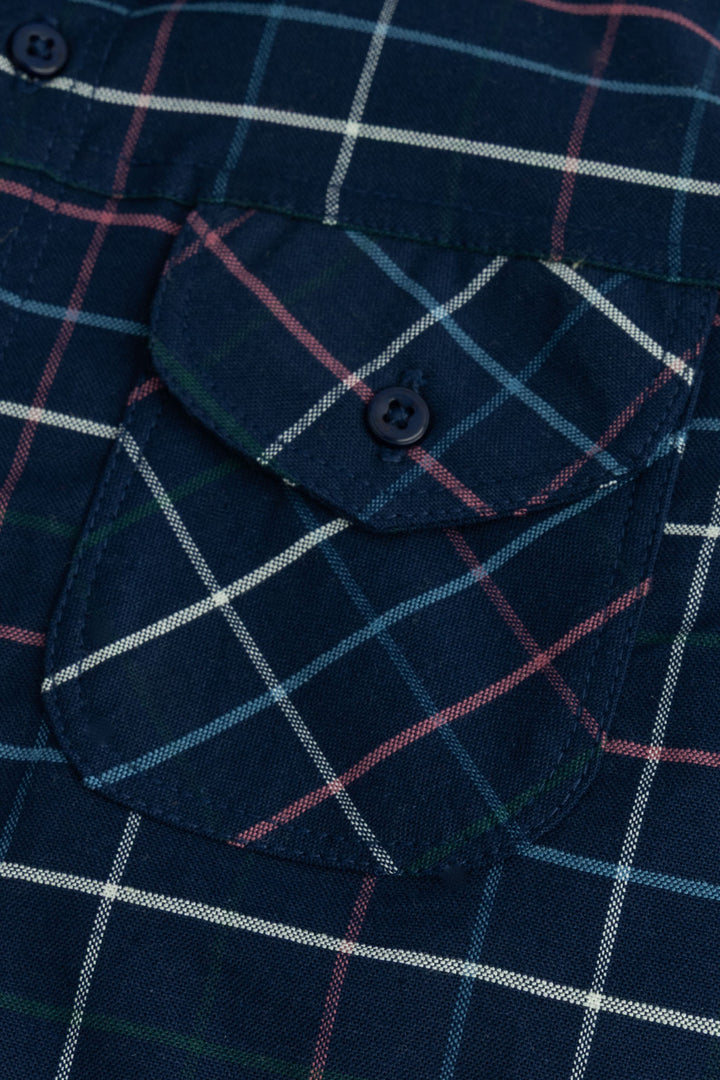 - Color: Navy Blue with multi-color plaid.