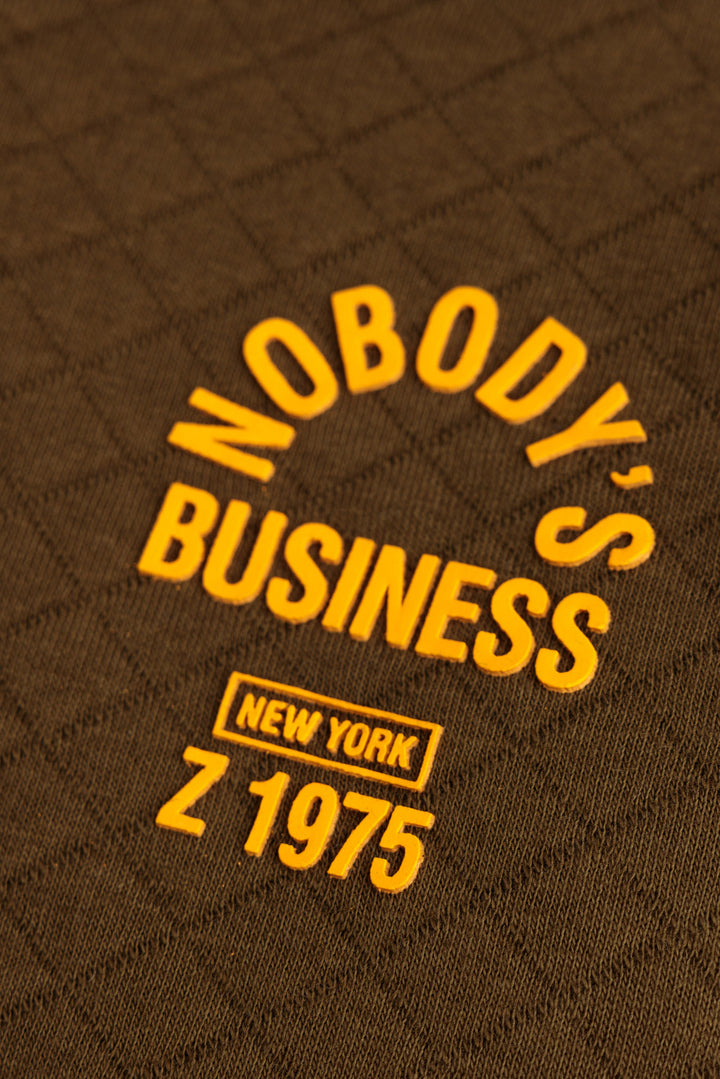 - Graphic: Chest graphic featuring "NOBODY'S BUSINESS" text with additional details (e.g., "NEW YORK Z 1975").