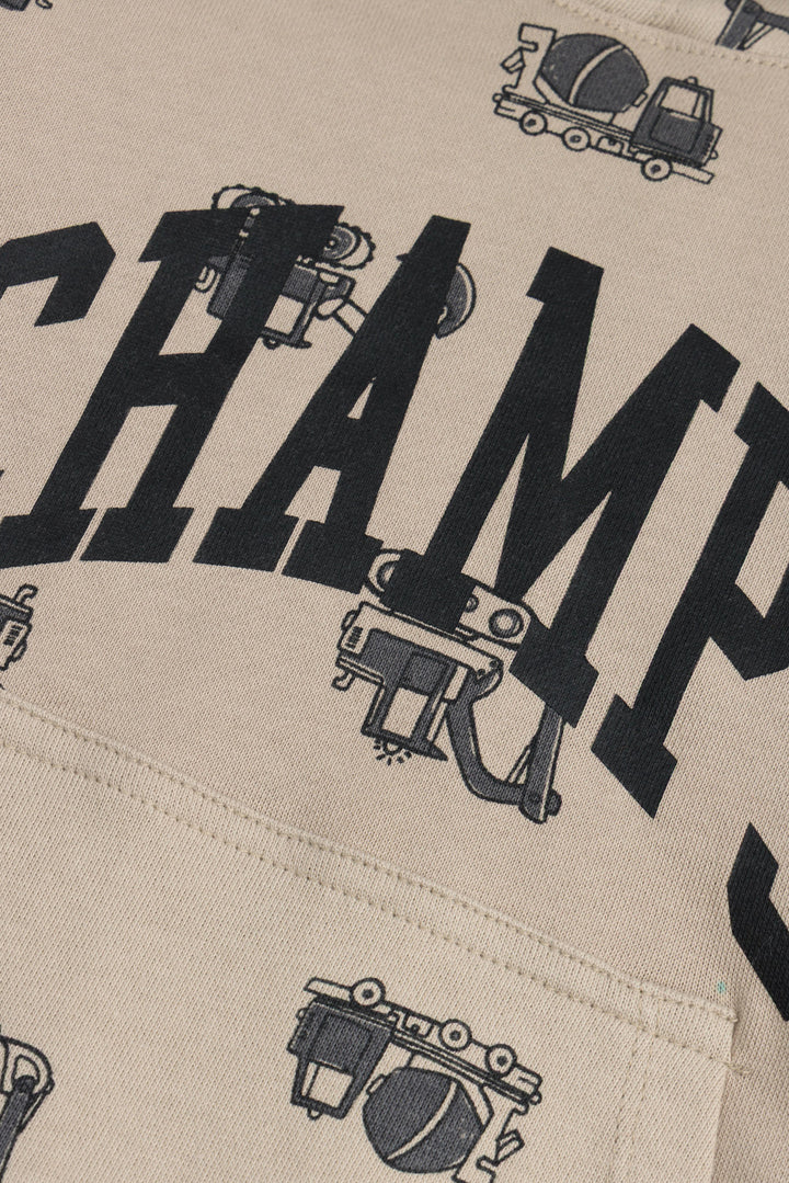 This unique piece features a playful all-over print of construction vehicles—excavators, cement mixers, and dump trucks—set against a neutral beige/khaki base. Crafted from soft, cozy fleece fabric, it provides reliable warmth and a comfortable feel for playground projects or weekend play. The bold, arched "CHAMPS" graphic across the chest celebrates his energetic spirit. It's the perfect hoodie for any little future builder or engineer!