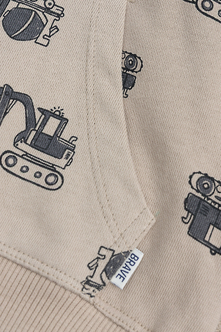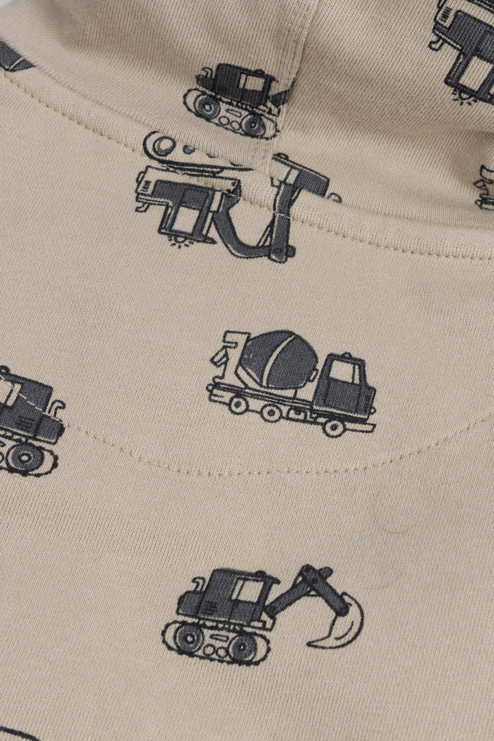 · Pattern: All-over Construction Vehicle Print (e.g., excavators, cement mixers) in black/dark contrast on a beige/khaki base.