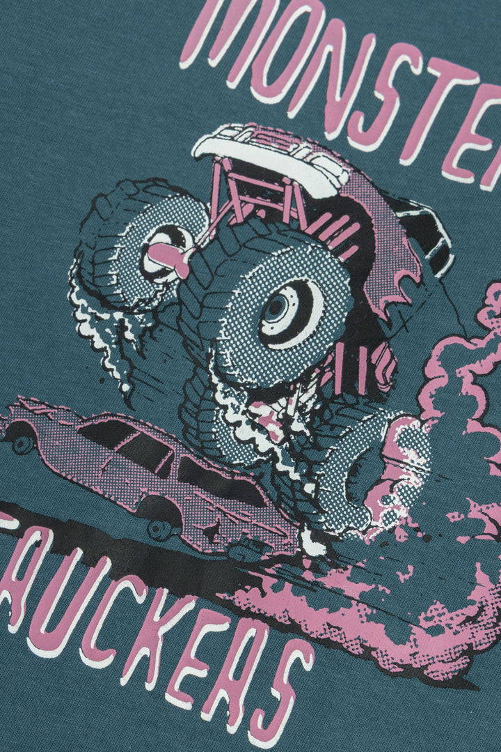 - Graphic: Large Monster Truck graphic in pink, purple, and white, with "MONSTER TRUCKERS" text on the chest.