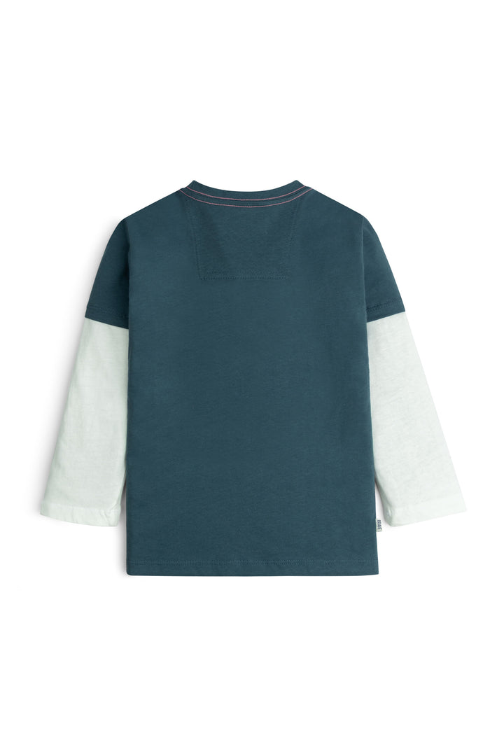 - Sleeves: Full-length light grey sleeves with dark teal short sleeves layered over.