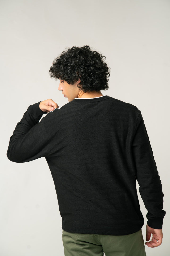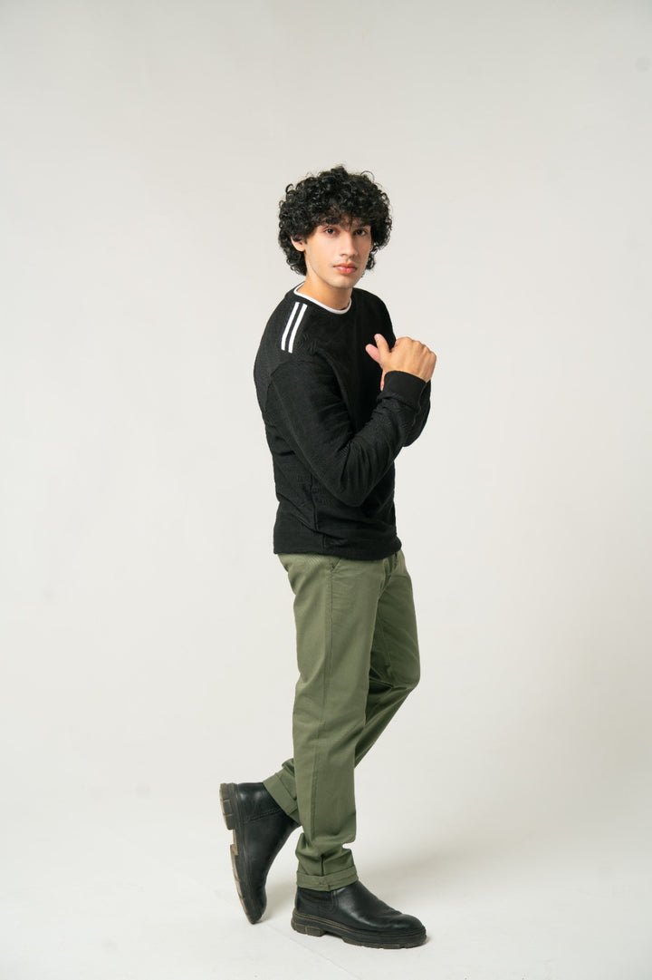 The perfect blend of comfort and athletic style. Soft, textured black knit with iconic white dual-stripes on the shoulder. Effortlessly stylish for casual wear or relaxing. Your new essential.