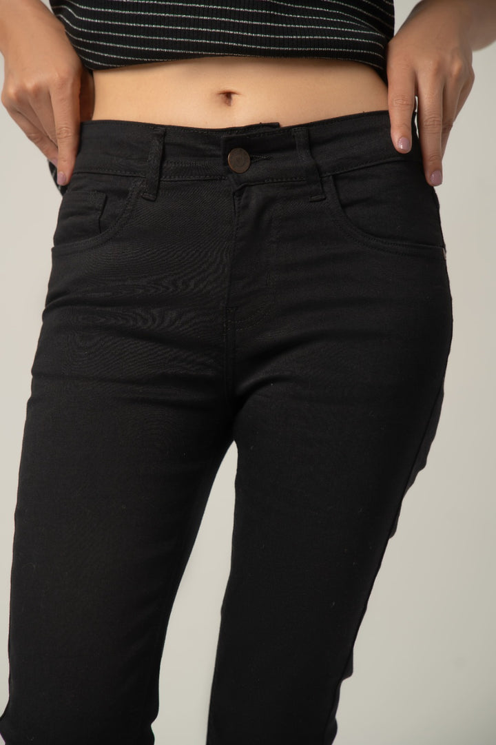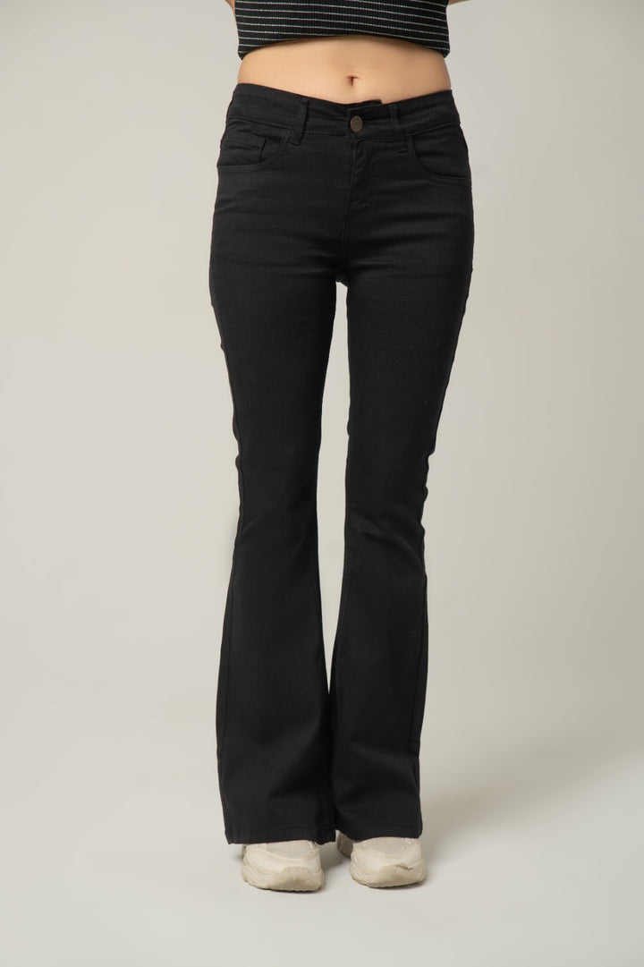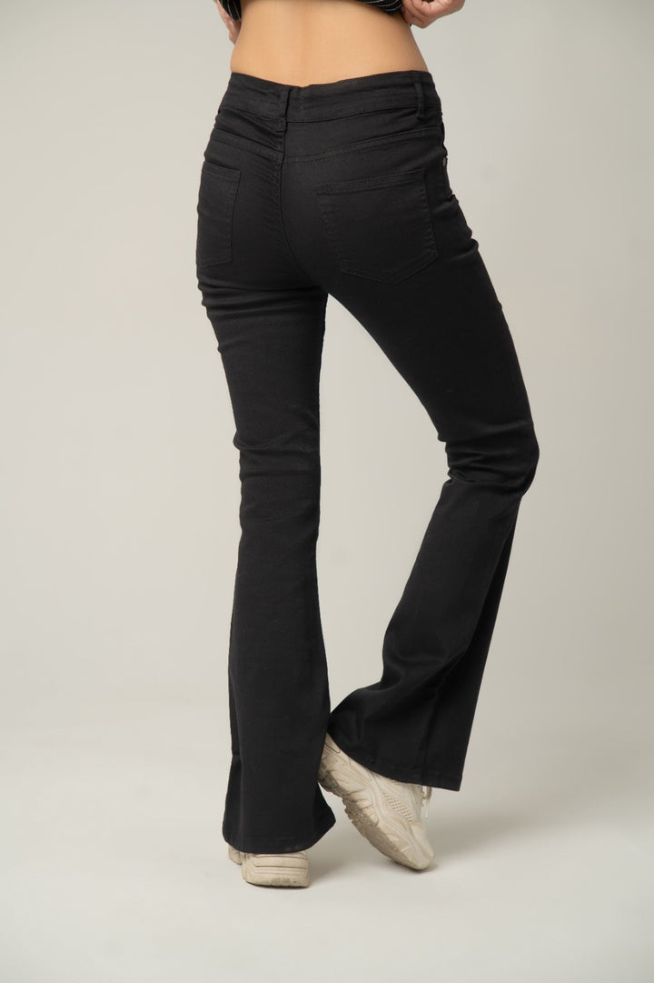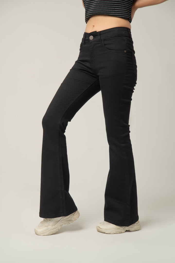 Step back into a classic silhouette with these flattering Black Flared Denim Jeans. Featuring a high-rise waist and a fit that is snug through the hip and thigh before flaring out below the knee. Made from comfortable, stretch black denim, these jeans offer a timeless style that elongates the leg. Perfect for pairing with fitted tops and platform shoes for a retro-chic look.