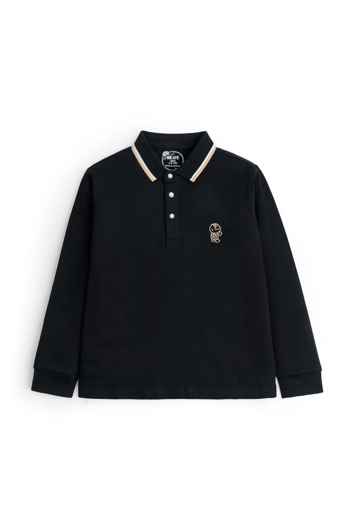 This classic boys’ black polo shirt with long sleeves features a playful embroidered teddy bear design and a stylish contrasting collar. Perfect for both casual and semi-formal wear.