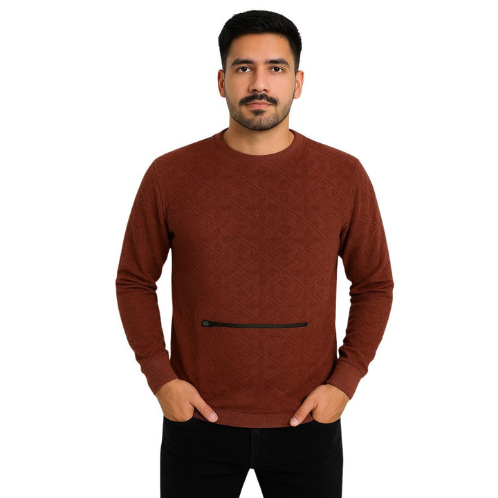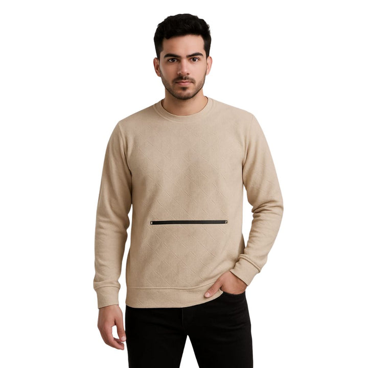 Elevate your everyday style with this modern men’s sweater, crafted from soft woven fabric with a subtle diamond texture. The classic crew neckline and ribbed trims keep the look timeless, while the contrast horizontal zip pocket adds a sleek and functional detail.