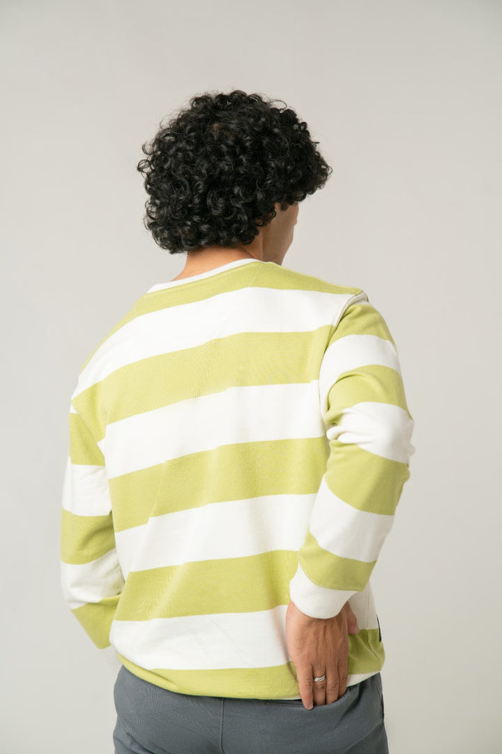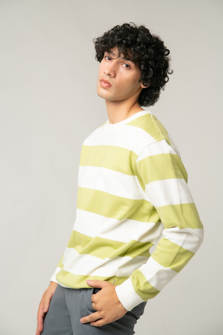 This men’s sweatshirt features bold green and white horizontal stripes, offering a fresh and stylish casual look. Made with soft, breathable fabric, it’s perfect for everyday wear, lounging, or layering during cooler weather.