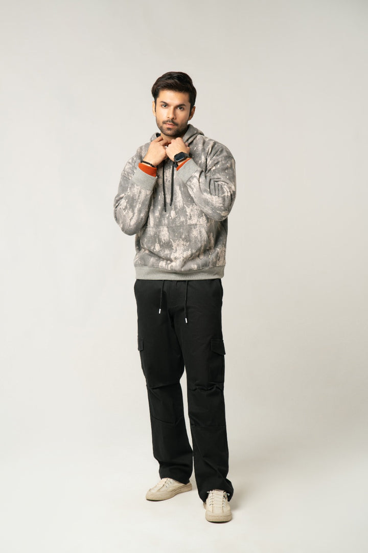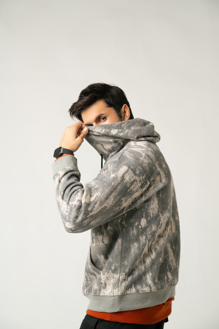 This men’s hoodie features a unique stone-wash camouflage-inspired design in shades of grey, perfect for modern streetwear style. Made with a soft cotton-blend fabric, it’s comfortable, durable, and versatile for layering in cooler weather.