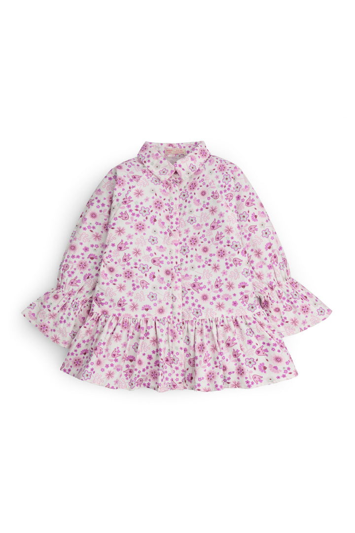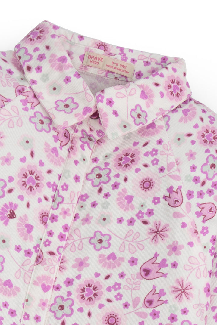 This adorable Girls' Shirt Dress is the perfect blend of sweet sophistication and playful style. Crafted from a soft, lightweight woven fabric, it features a vibrant, all-over pink and lilac floral print on a clean white background. The dress is designed with a classic button-up shirting top and cascades into a fun single-tiered ruffle skirt.