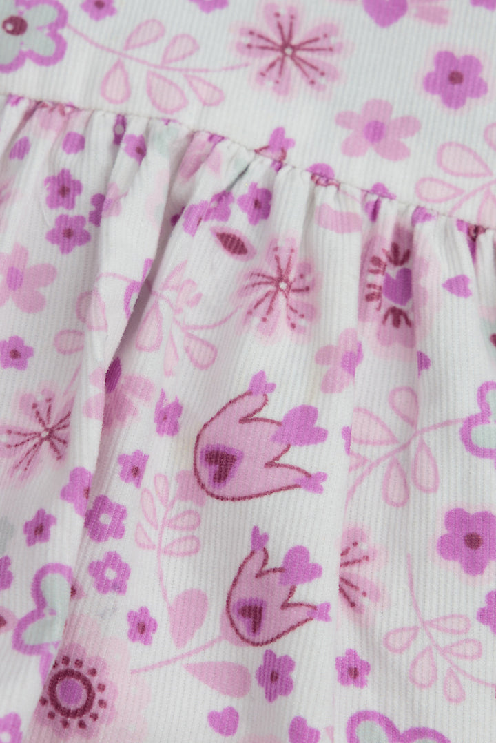 - Pattern: All-over Pink and Lilac Floral Print on a White base.