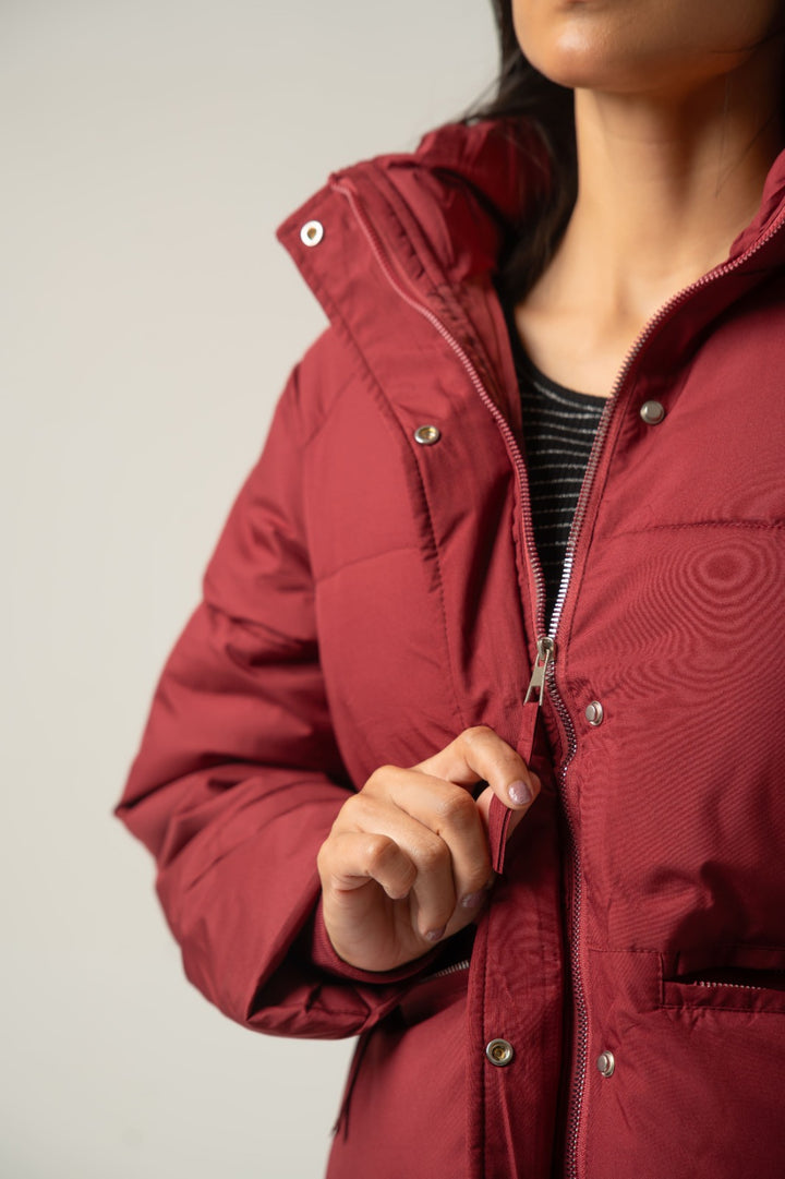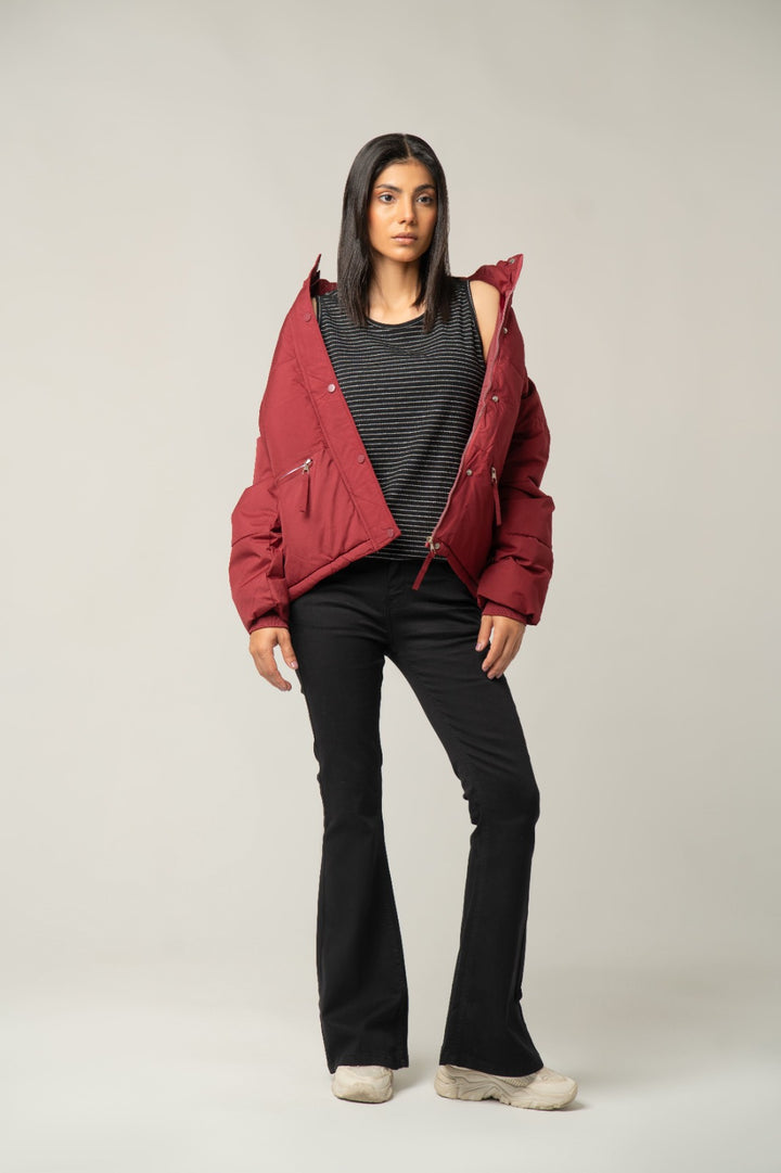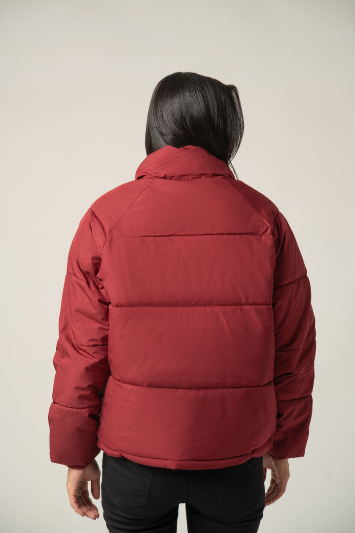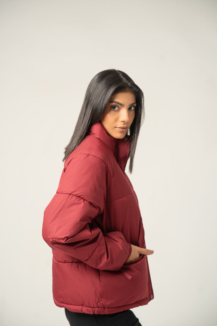 Featuring a cozy, insulated quilted construction and a high stand-up collar for extra protection against the cold. The jacket has a full zipper closure concealed by a snap placket and two zippered waist pockets. Its cropped, boxy silhouette makes it a perfect, on-trend piece for effortless winter layering.