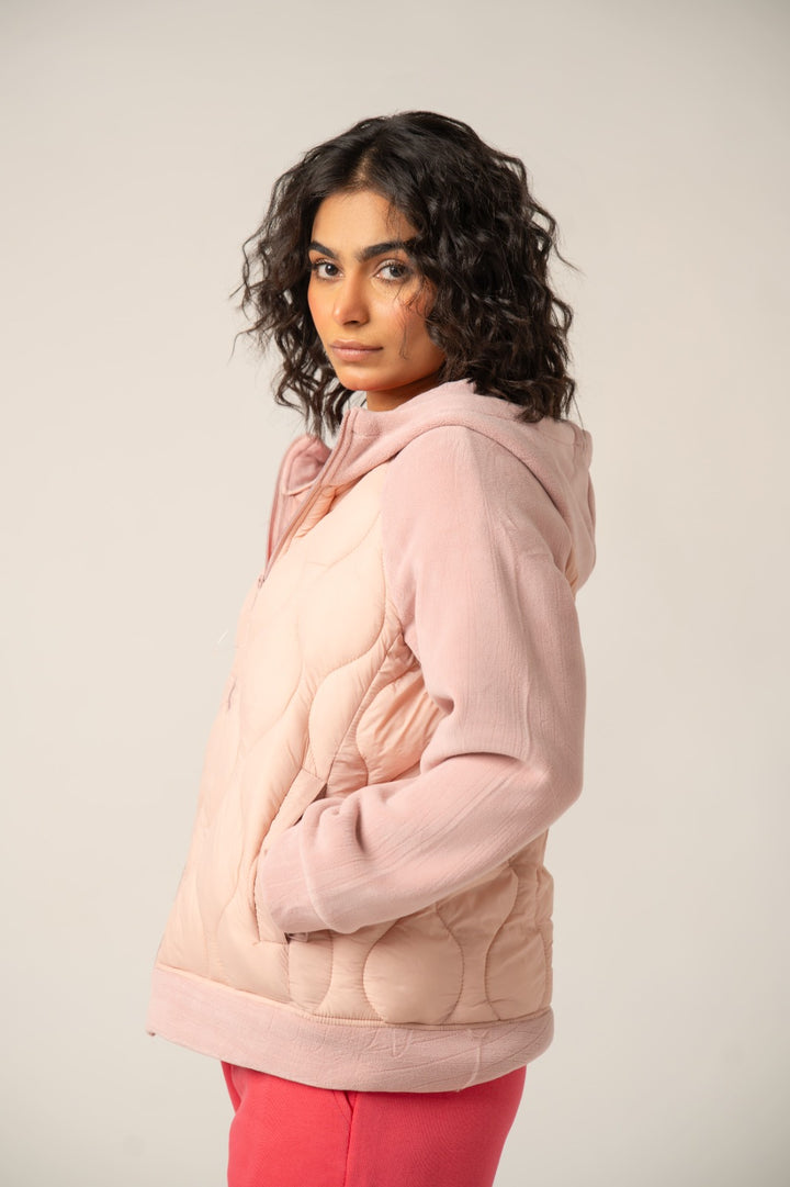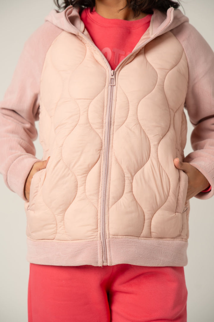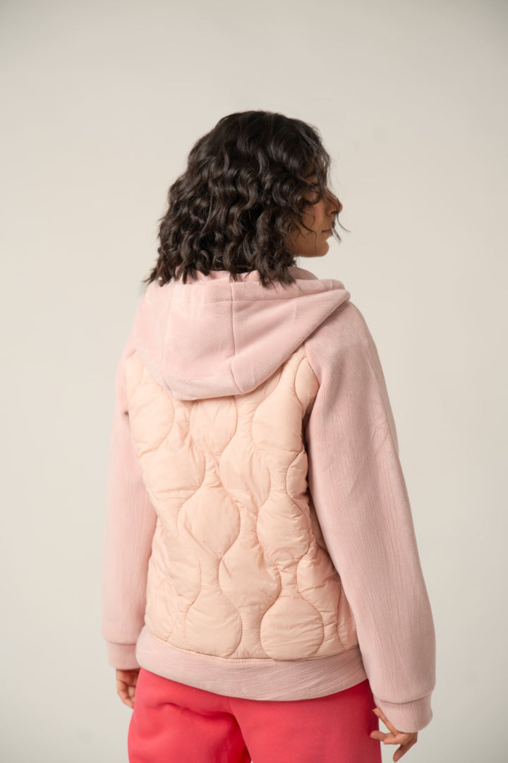 Construction: Hybrid design combining puffer body with knit/fleece sleeves and back.