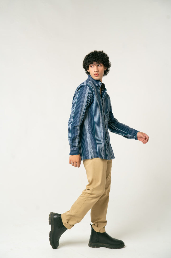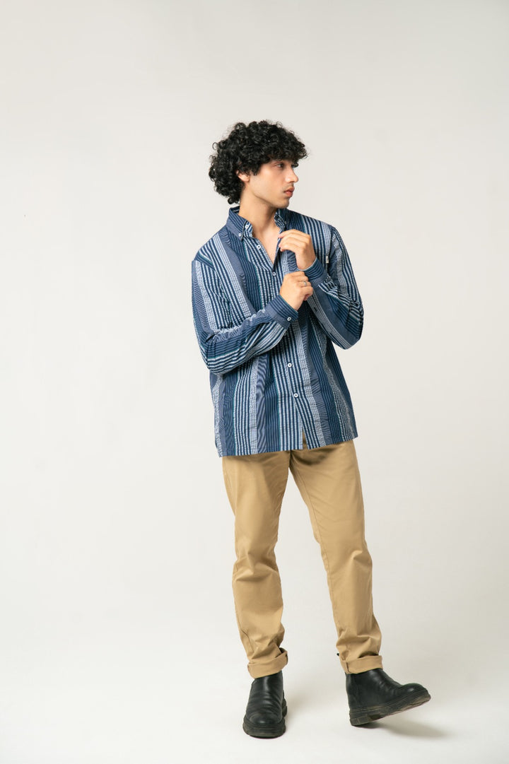 Make a confident statement with this eye-catching Men's Multi-Stripe Casual Shirt. Crafted from a soft, breathable cotton or cotton-blend fabric, this shirt features a bold, intricate pattern of vertical stripes in varying thicknesses and shades of Deep Blue, Navy, and Cool Grey.