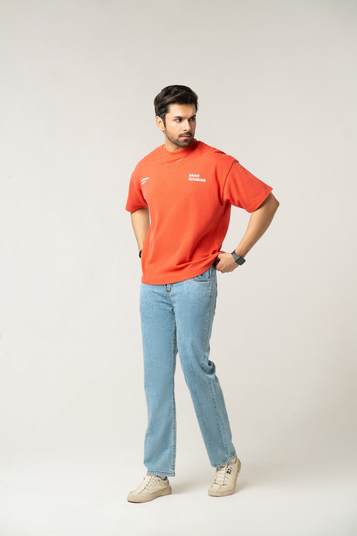 Embrace casual comfort with a subtle message in this Oversized Rust Orange Tee. Crafted from a soft, textured fabric, it offers a relaxed drape and modern fit. Featuring understated white text graphics on the chest: "EMERGE BOLDLY" and "BRAVE HORIZONS". Perfect for everyday wear, this tee combines comfort with a quiet confidence.