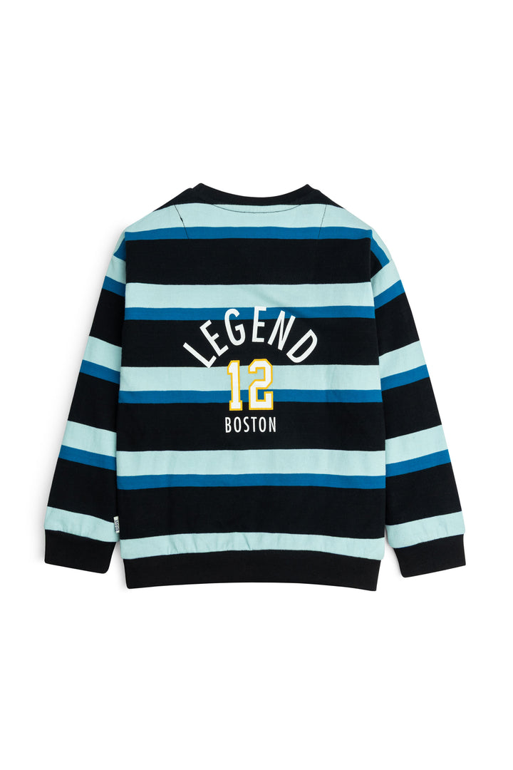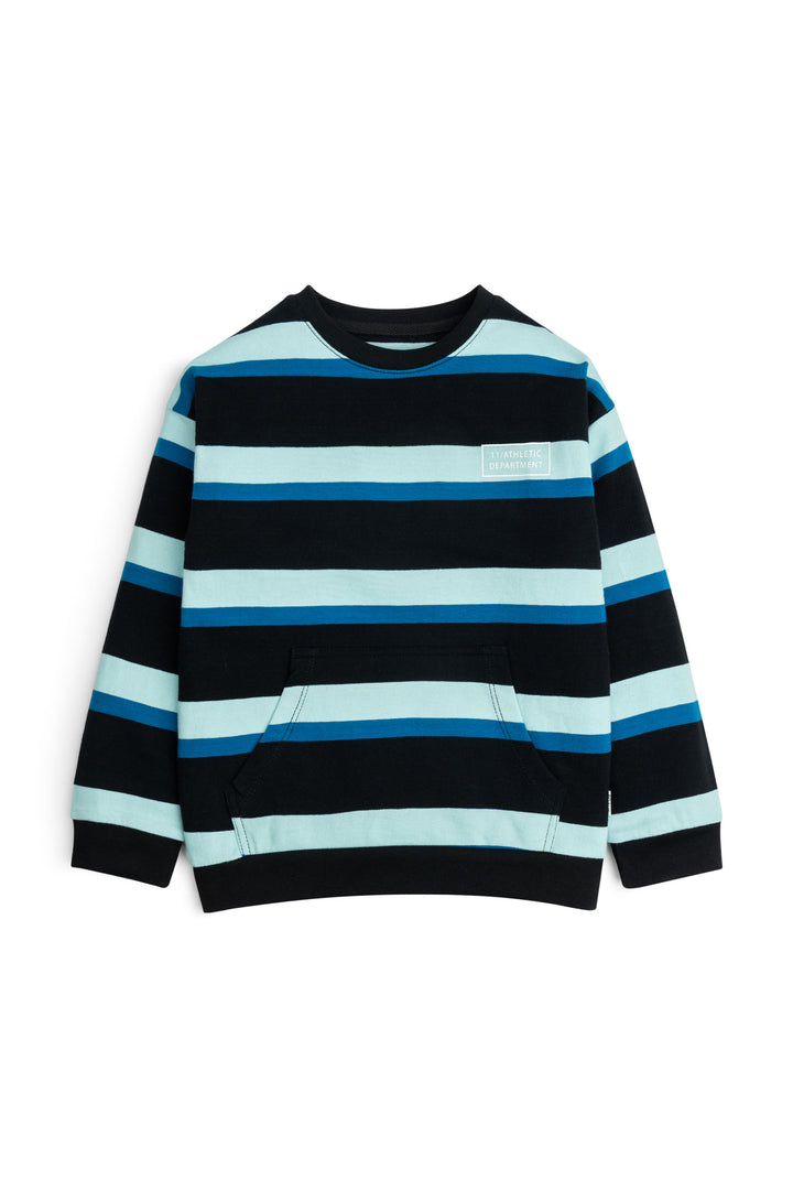 The bold, horizontal stripe pattern in black, royal blue, and mint green creates a vibrant, athletic look that's easy to pair with his favorite jeans or joggers. Featuring a comfortable crewneck and a unique front pouch pocket, this sweatshirt combines classic appeal with playful functionality.