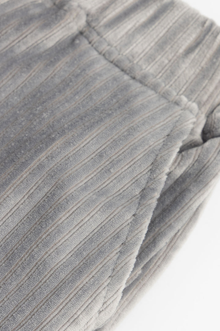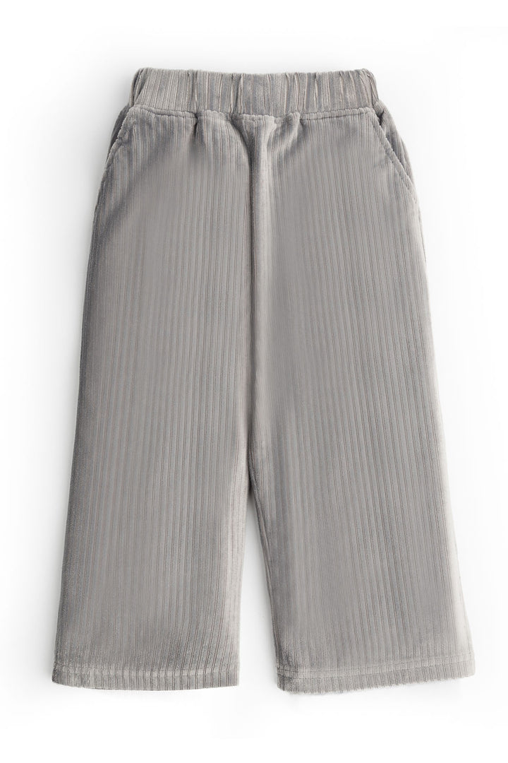 This cozy girls' velvet trouser in soft gray features a chic striped pattern, offering a comfortable fit with an elastic waistband. Perfect for casual or semi-formal occasions.