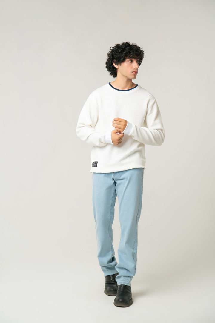 - Neckline: Ribbed crew neck with contrast tipping/binding (Dark Blue/Black).