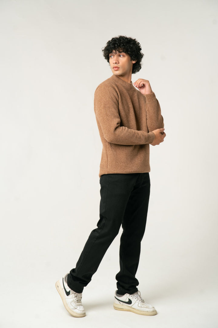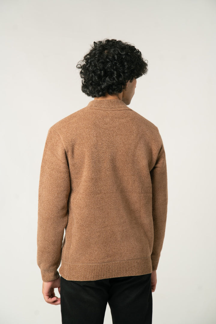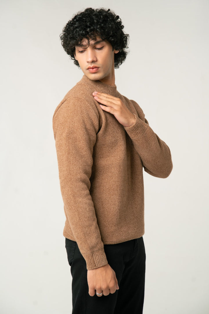 Add a touch of warmth and rich color to your wardrobe with this Camel Brown Mock Neck Sweater. Made from a soft, textured wool-blend fabric, it provides superior comfort and a sophisticated look. The subtle texture enhances its premium feel, while the mock neck offers a contemporary edge. An ideal choice for cooler days, effortlessly pairing with tailored trousers or jeans.