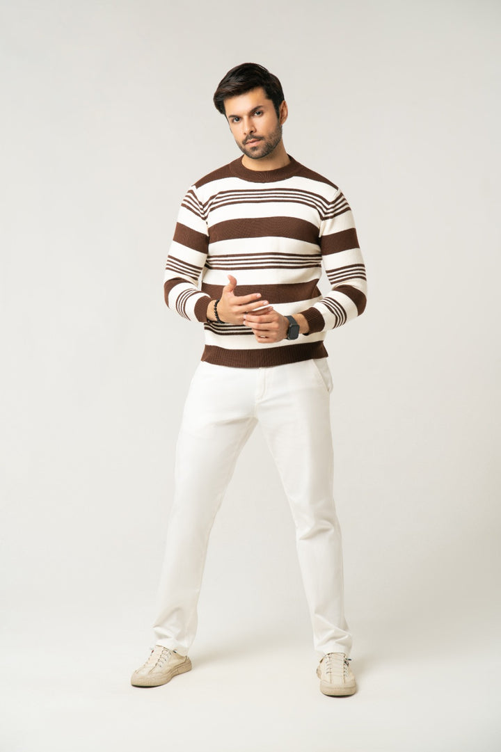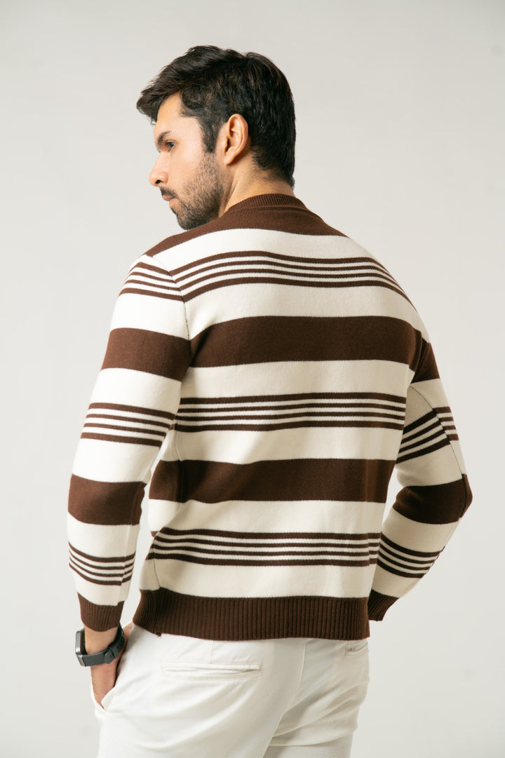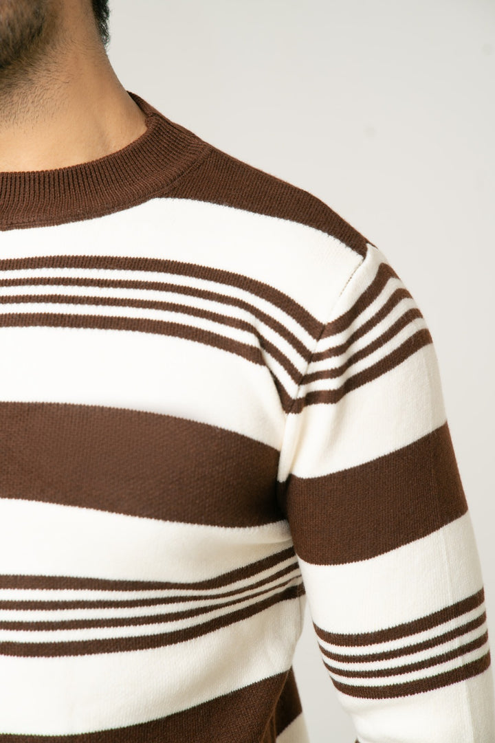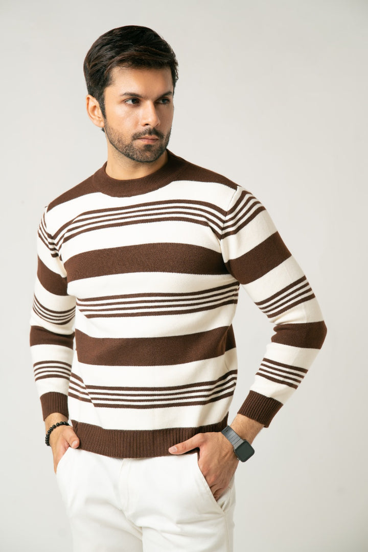 Step out in classic style with this sophisticated Brown and Cream Striped Sweater. Crafted from a soft, comfortable knit, it features a timeless pattern of varying width horizontal stripes in rich...