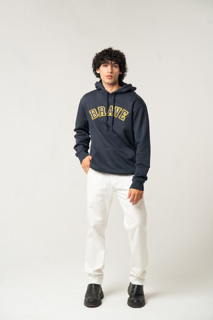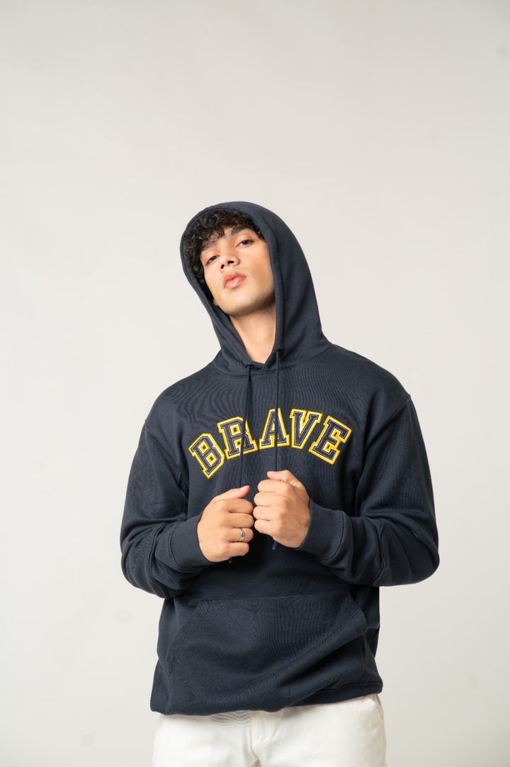 Show your spirit with this timeless Navy Blue Pullover Hoodie. Crafted from soft, comfortable fleece, this hoodie features a bold, yellow collegiate-style "BRAVE" chest graphic. With a classic fit, attached hood, and kangaroo pocket, it’s the perfect blend of comfort and sporty confidence for any casual outing.