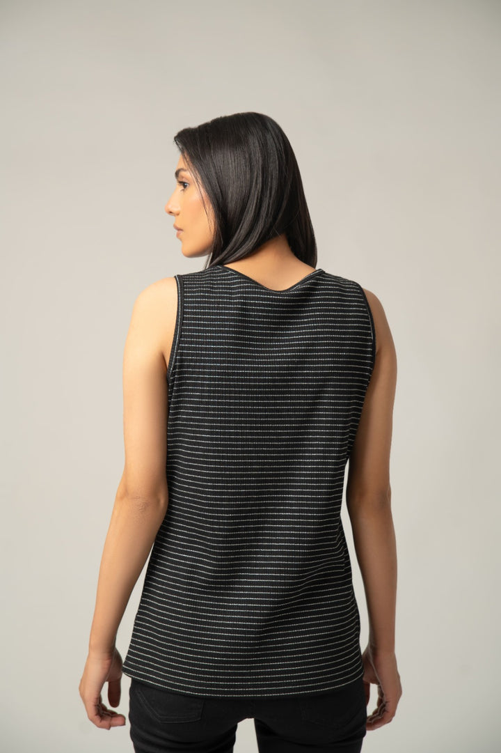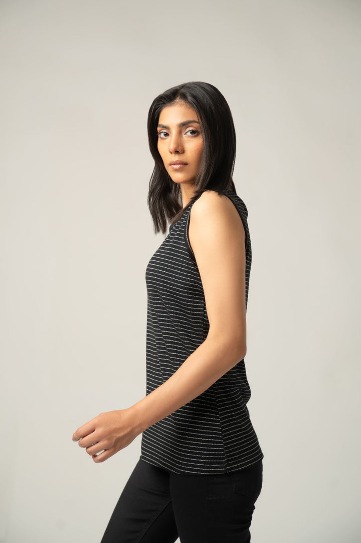 An essential base layer, this Black Stripe Tank Top offers timeless style and comfort. It's crafted from a soft, breathable knit fabric and features a subtle horizontal pin-stripe pattern and a fine ribbed texture. The classic crew neck and sleeveless cut make it perfect for layering under jackets and sweaters or wearing alone during warmer weather.