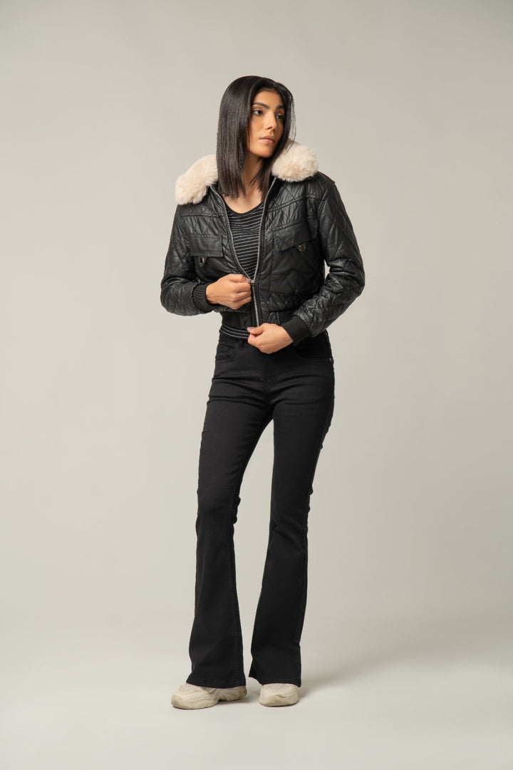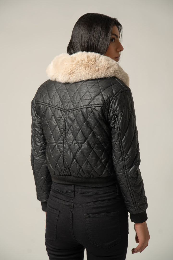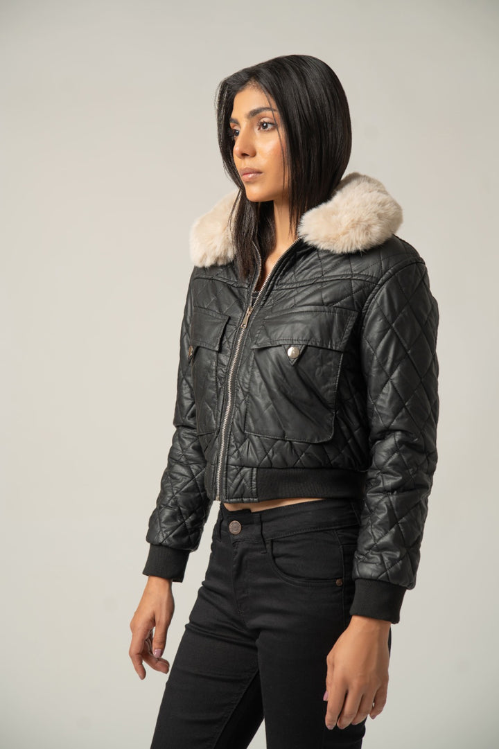 Rev up your outerwear collection with this edgy and cozy Black Faux Leather Bomber Jacket. It features a stylish diamond quilting pattern across the body and a cropped silhouette, perfect for pairing with high-waist denim. The jacket is finished with a soft, detachable faux fur collar for extra warmth and glamour, along with functional chest pockets and a ribbed hem that defines the classic bomber shape. This piece is ideal for adding a touch of attitude to any outfit.
