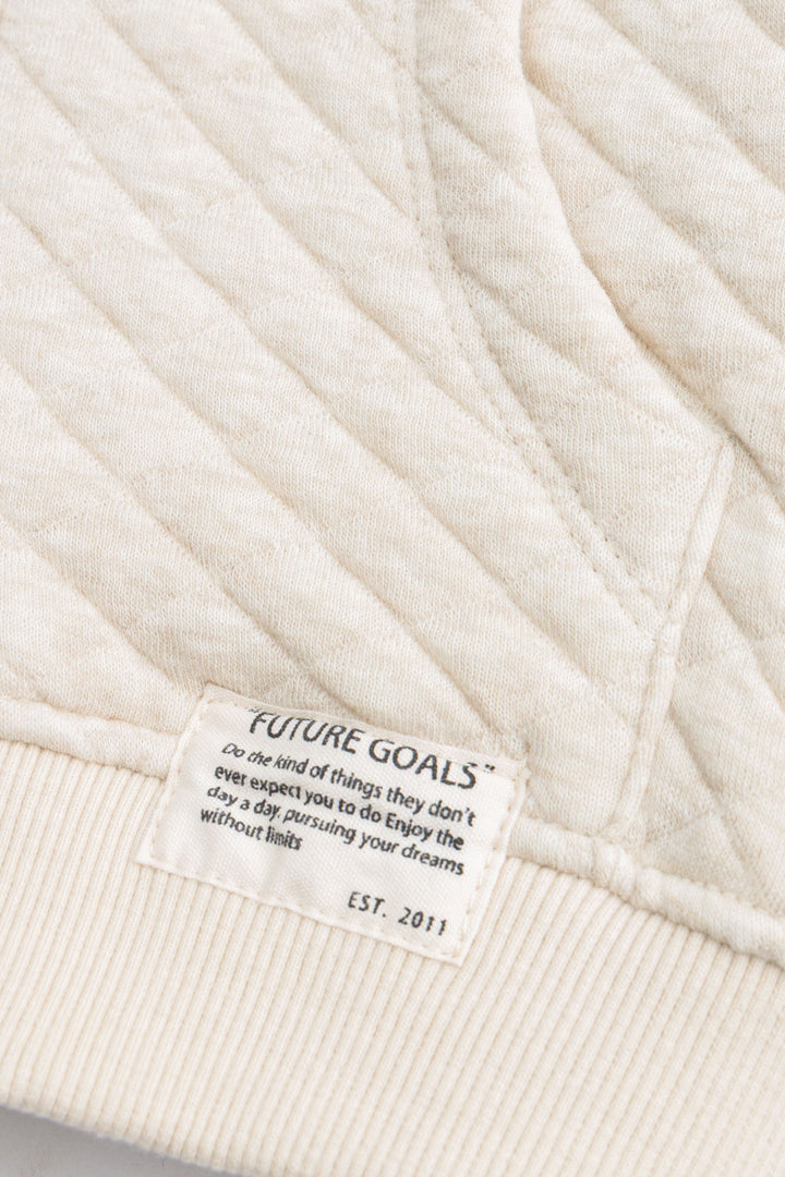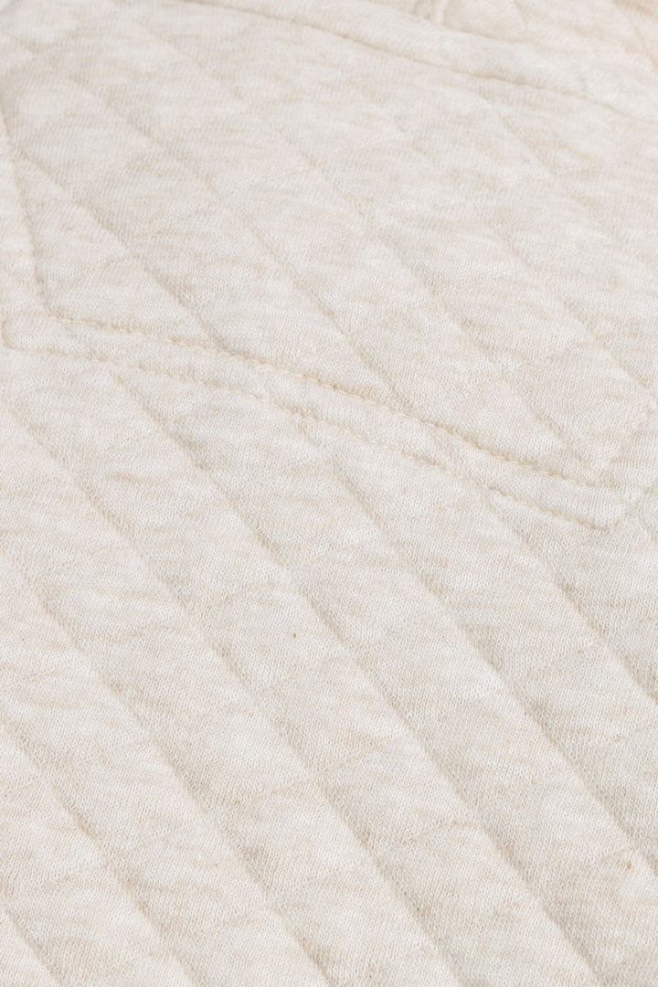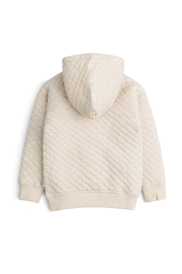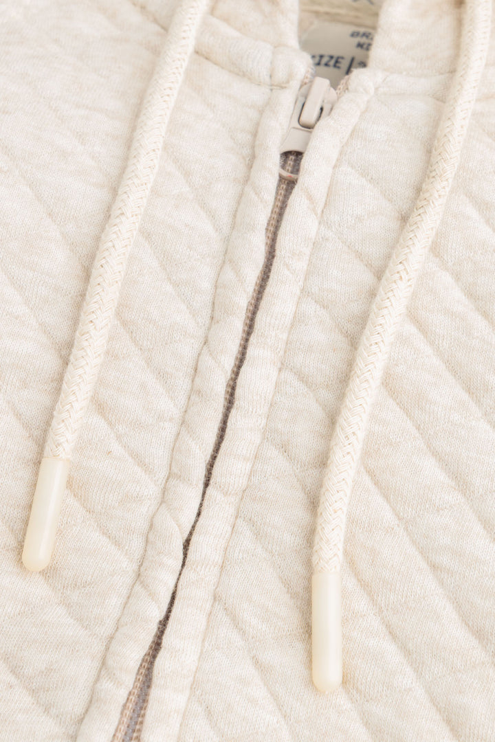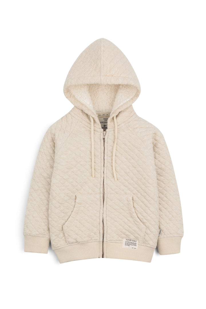 Keep him snug and stylish in this ultra-cozy Quilted Teddy Fleece Hoodie. Made from a soft, textured fabric with a subtle diamond quilting pattern, this full-zip jacket is perfect for layering during colder months. It features a generous hood, a split kangaroo pocket for warming hands, and soft, ribbed cuffs and hem. The neutral cream/beige color and comfortable fit make it an easy choice for everyday wear.