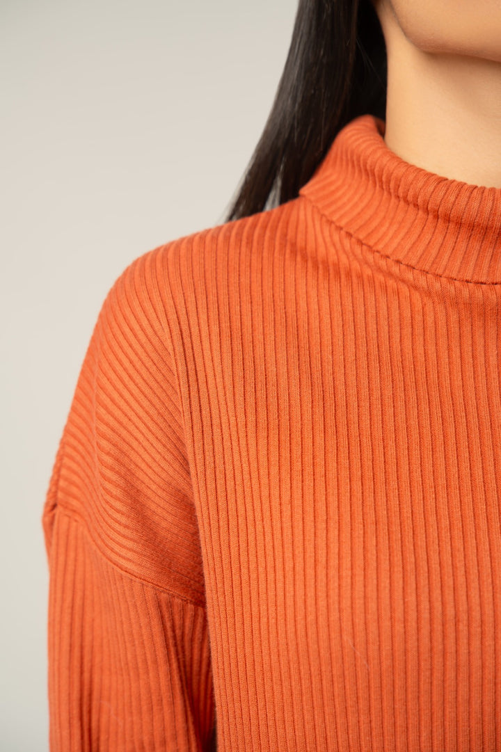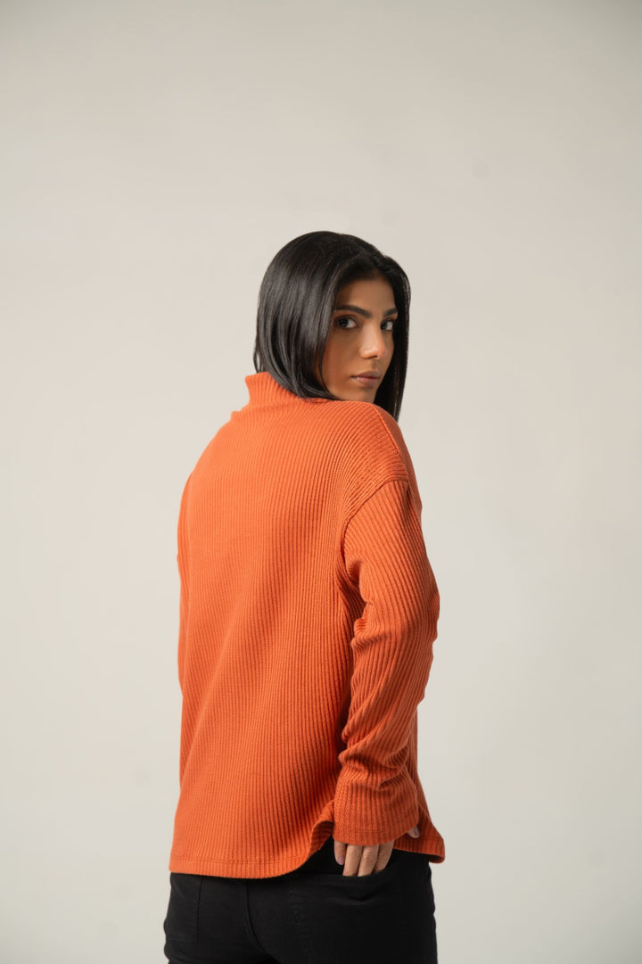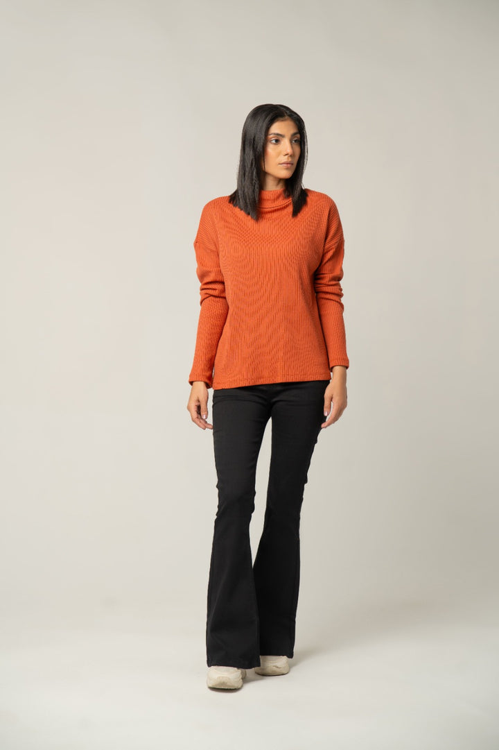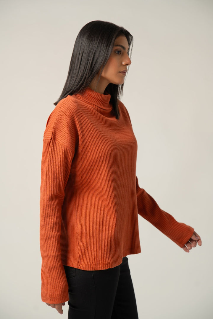Wrap yourself in warmth and color with this stylish Terracotta Orange Sweater. Crafted from a soft, stretchable knit, it features a prominent vertical rib texture that provides a flattering fit and cozy feel. The elevated mock neck and long sleeves make it an ideal choice for fall and winter layering. Its rich, earthy tone adds a sophisticated pop of color to any casual outfit.