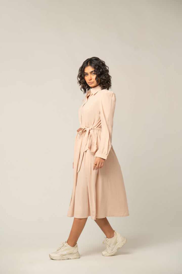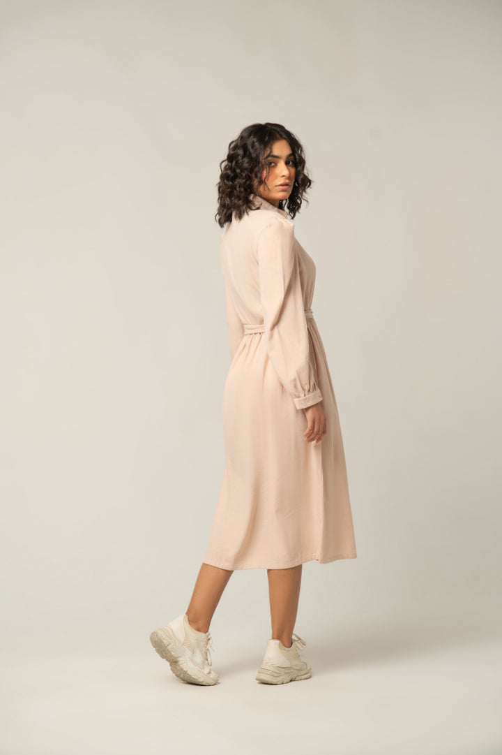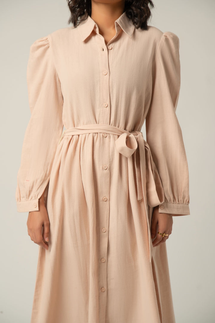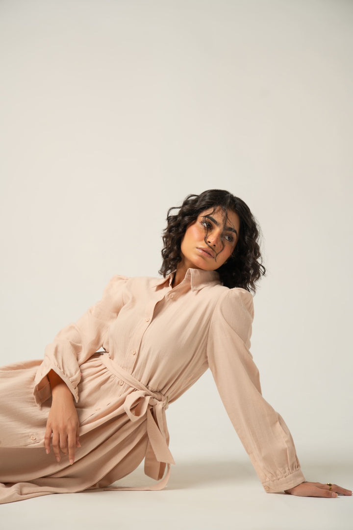 Made from a rich, lightly textured fabric, this dress drapes beautifully to a maxi/midi length. It features a classic button-down front, a crisp collar, and an elegant defined waistline with subtle gathering that creates a flattering silhouette. The full, wide sleeves complete the chic, elevated look, perfect for versatile styling from casual to semi-formal.