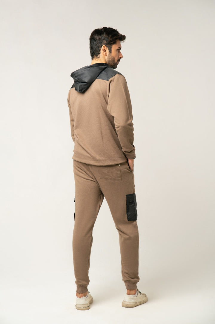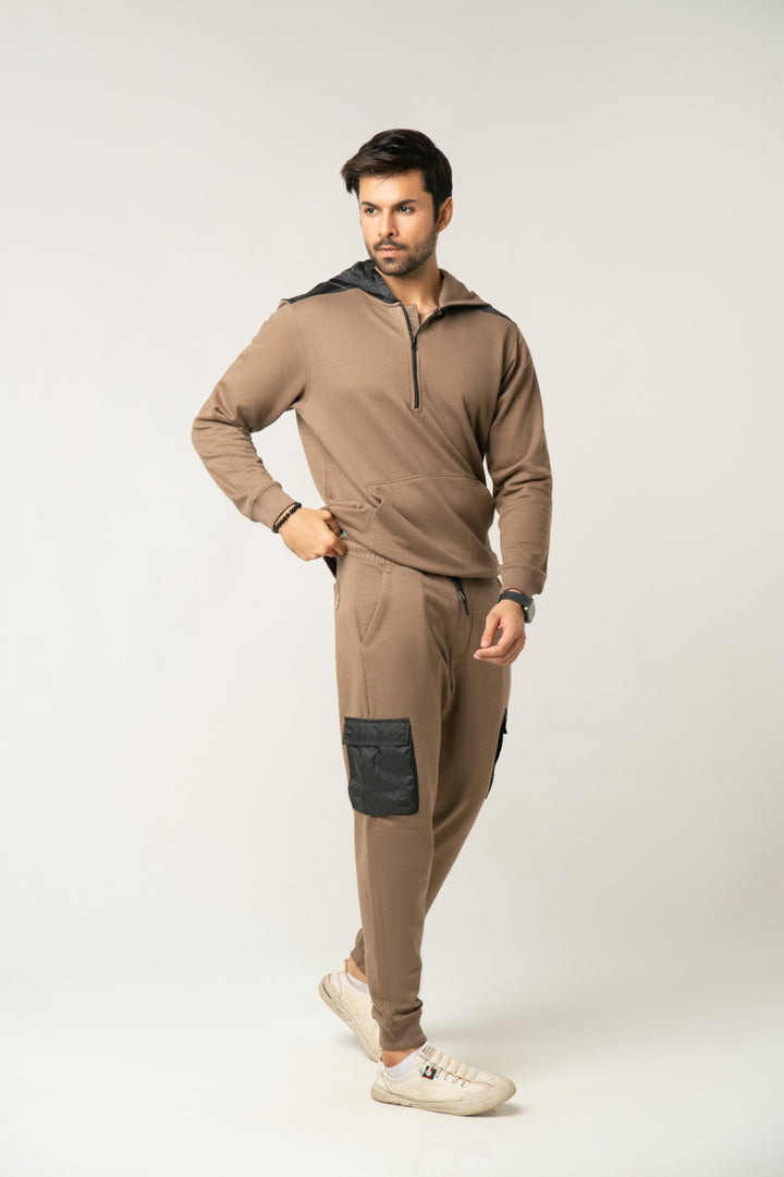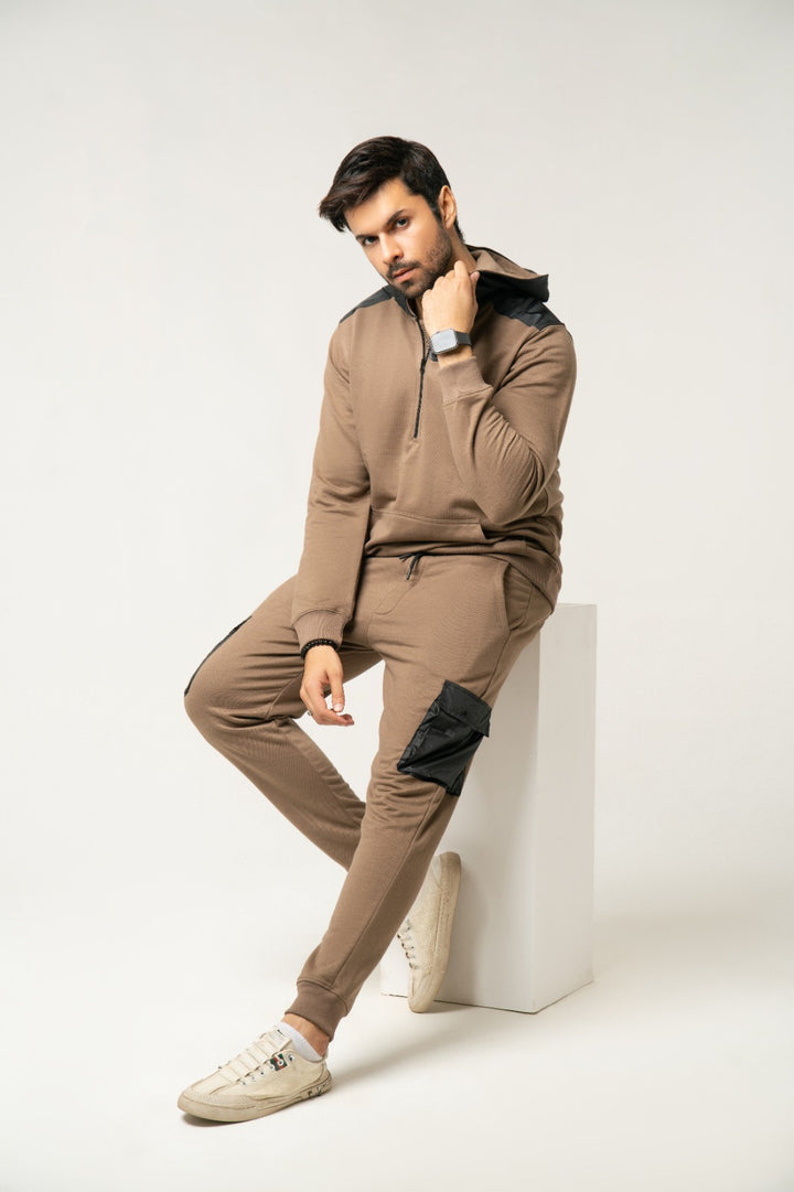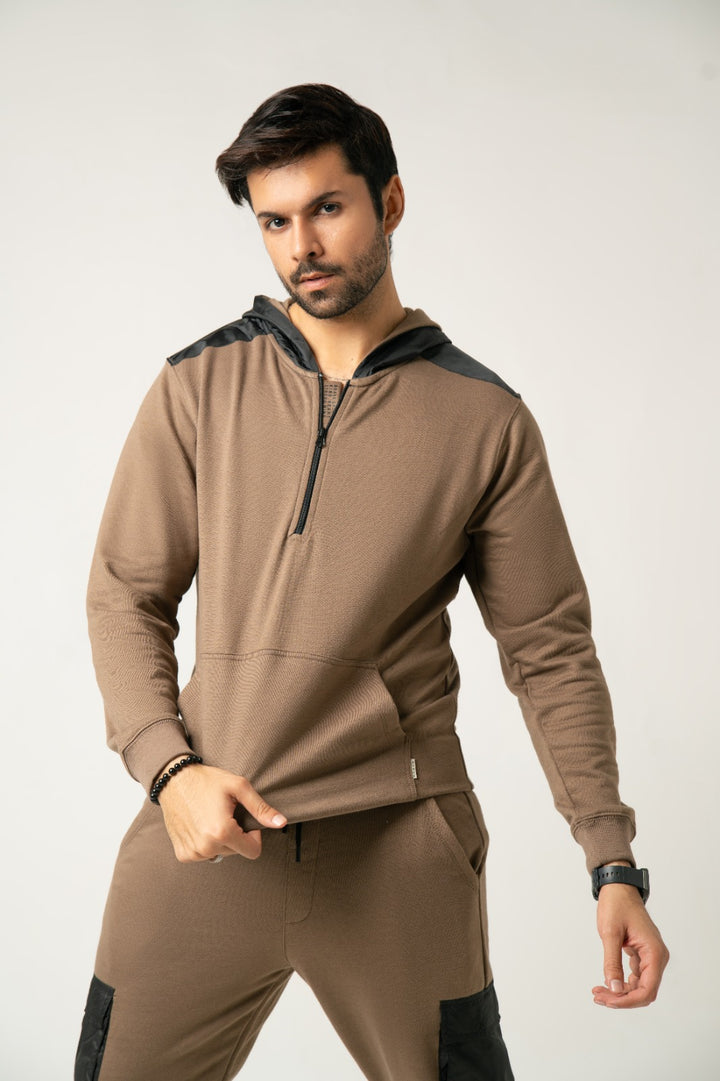 Step up your street style with this dynamic Mocha Brown Quarter-Zip Hoodie. Crafted from a comfortable textured knit, it features striking black contrast paneling on the shoulders and hood for an edgy, modern look. The practical quarter-zip closure and front kangaroo pocket add functionality to its sleek design. Perfect for an athletic aesthetic or elevated casual wear.