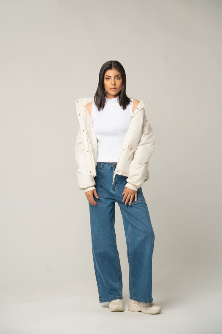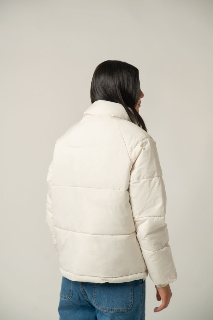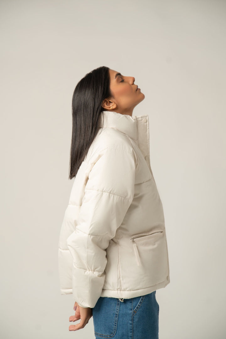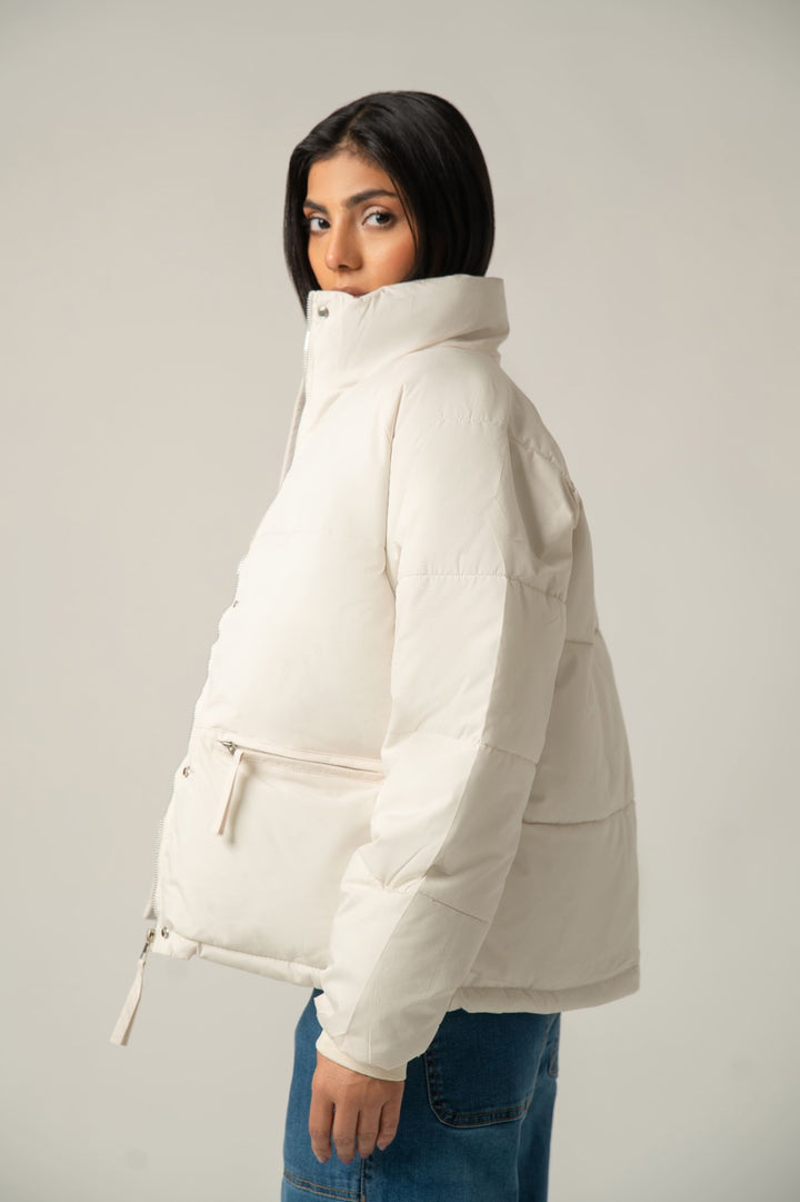 Featuring a cozy, insulated quilted construction and a high stand-up collar for extra protection against the cold. The jacket has a full zipper closure concealed by a snap placket and two zippered waist pockets. Its cropped, boxy silhouette makes it a perfect, on-trend piece for effortless winter layering.